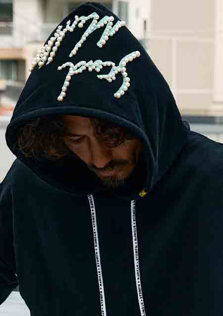 スウェットやフーディーにあしらわれたパールチャームが、